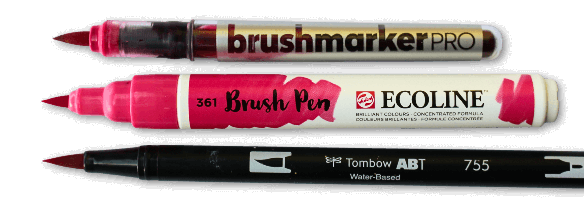 Hierboven zie je een paar brushpennen waar wij graag mee werken! Wist je dat je dat zelfs met goedkope stiften kunt brushen? Waarom dan onze liefde voor brushpennen? Door de kwastpunt kleur je gemakkelijk grote oppervlaktes in.